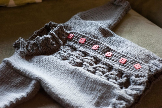 This week I completed my hairdresser’s pending baby’s Peapod Baby Jacket. I can’t wait to give it to her at my last hair appointment next week. She’s taking 6 months off, I fear she may not return and I’ll be down one awesome hairdresser… I got the buttons from Buttonmania, what do you think?