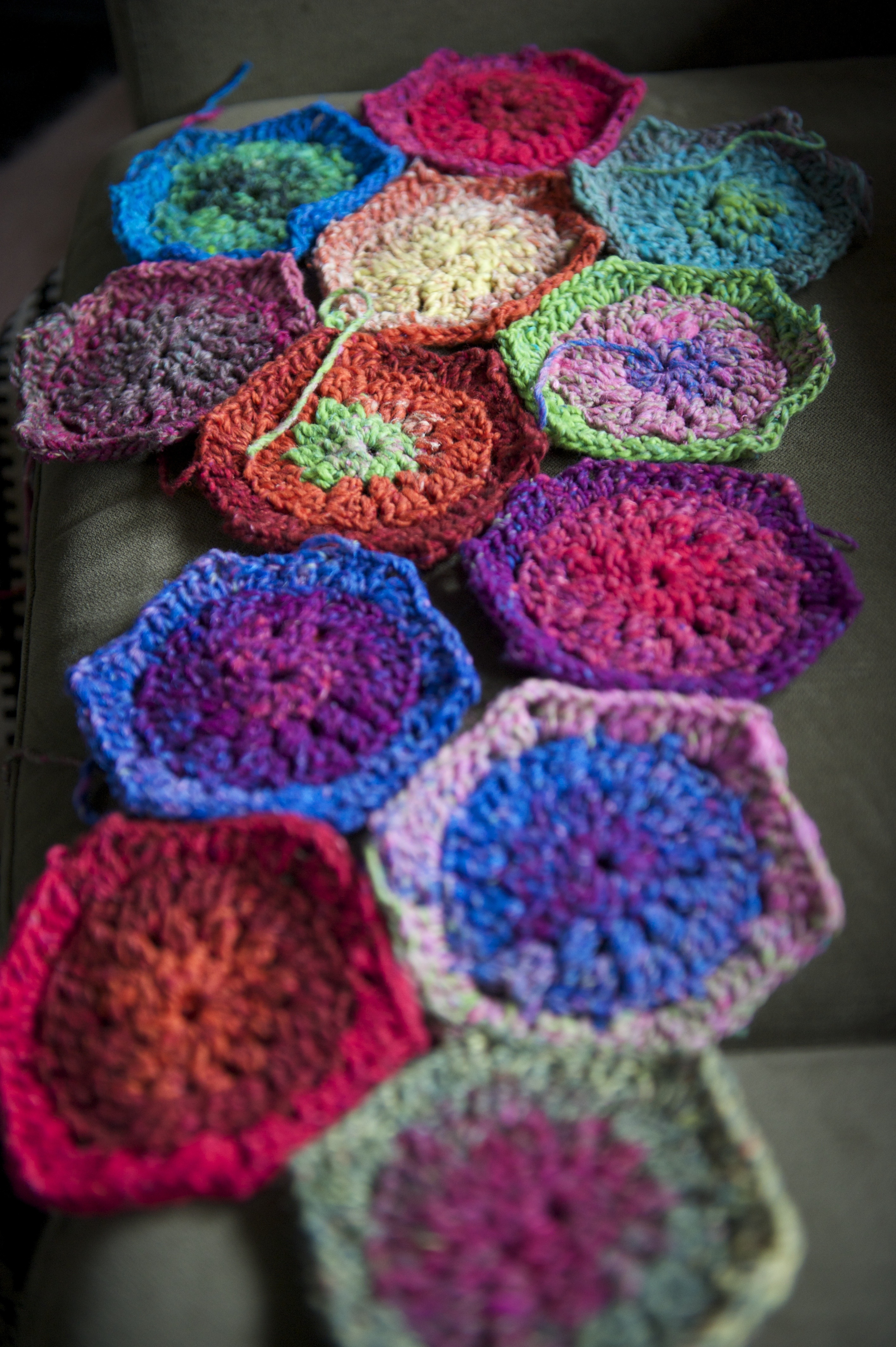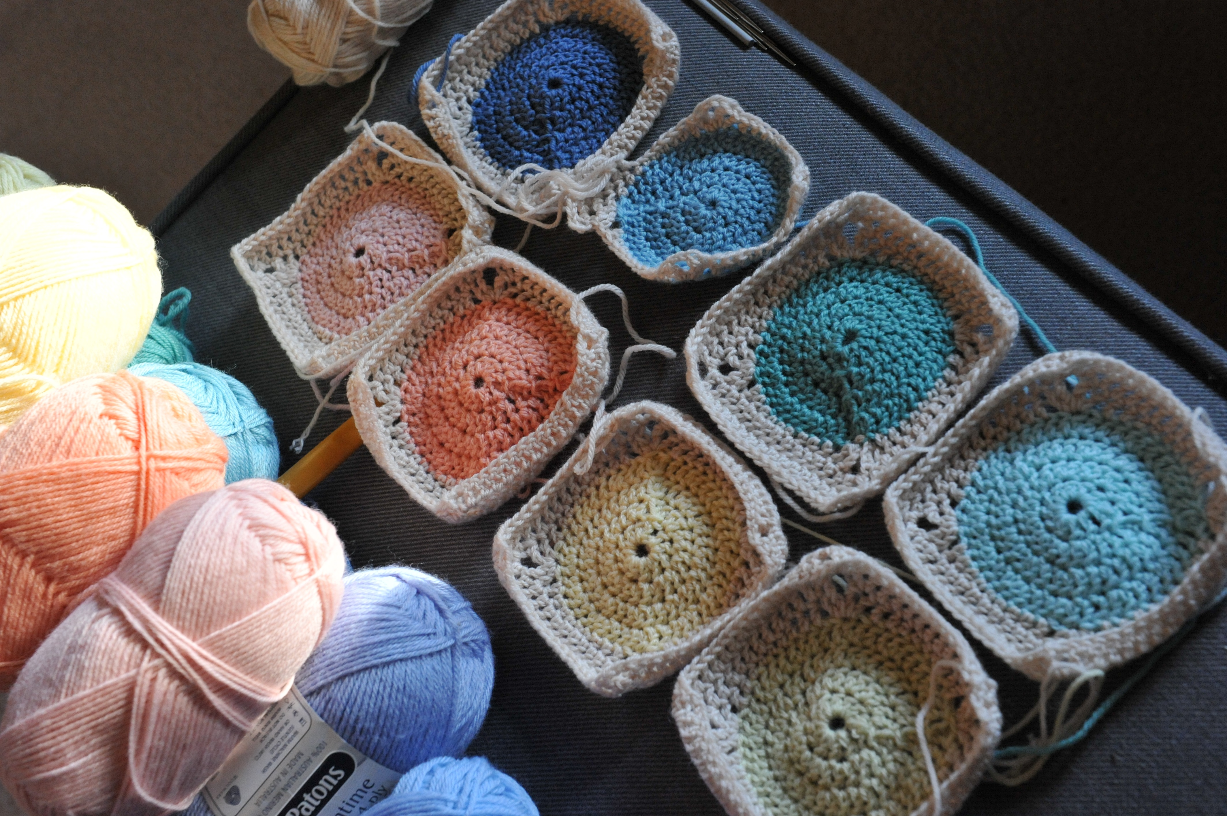 I’m loving the Polka Dot rug that I’m making for my sister’s baby E.T.A. 7-10 weeks away, but probably just 7 weeks away. So far I’ve made a patch of each of the 13 coloured centres.