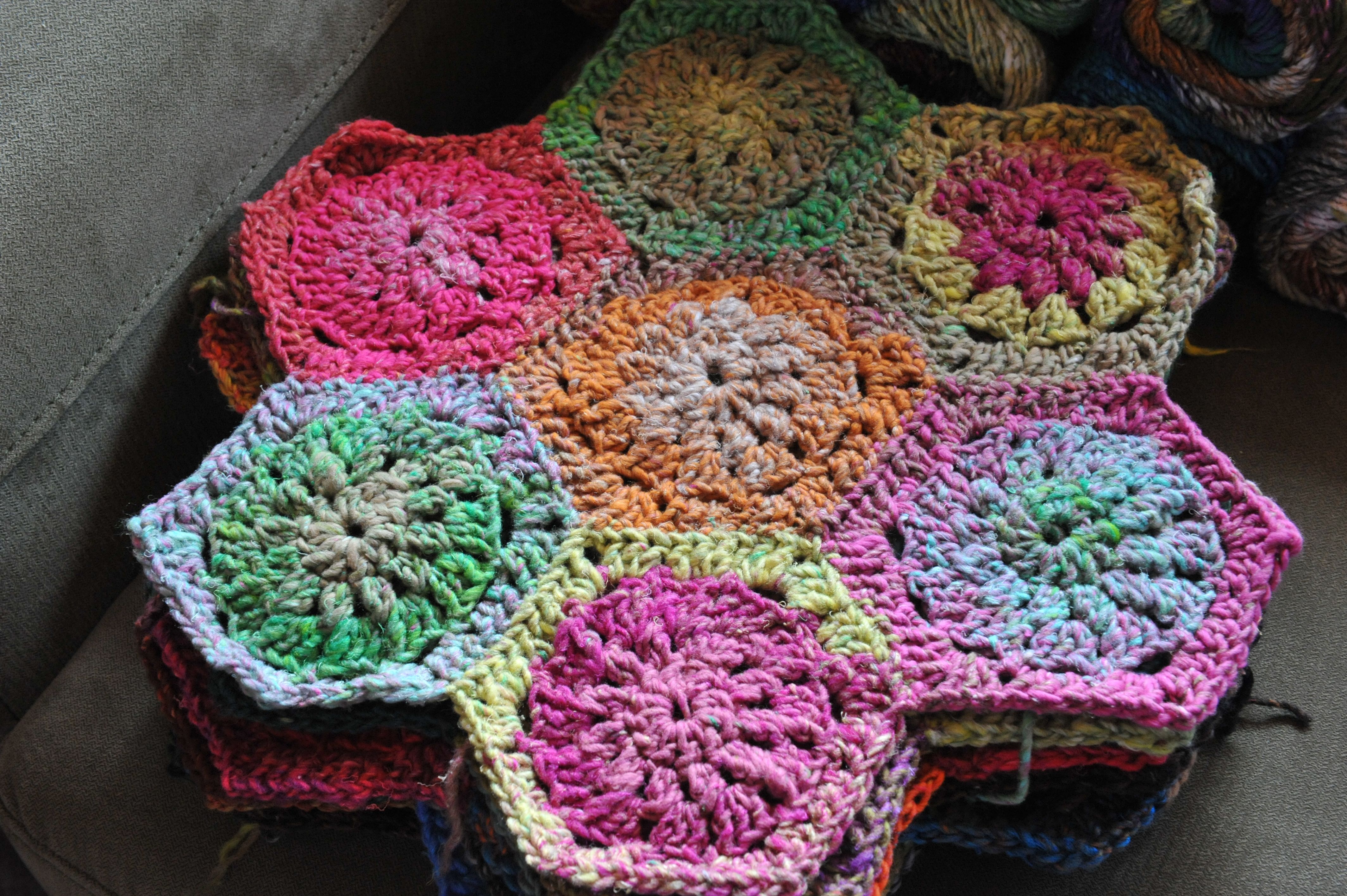 10 ‘rosettes’ of my crochet blanket are complete. I’m sewing these up as I go, so I don’t have to deal with all of the sewing up at the end. Who wants that?