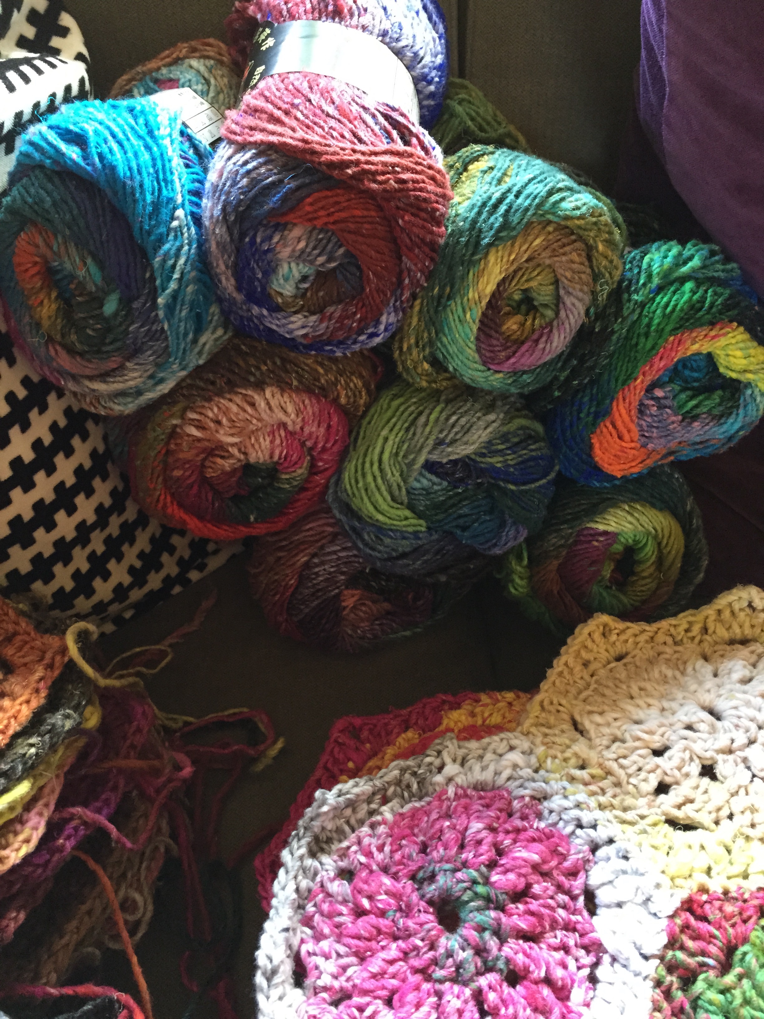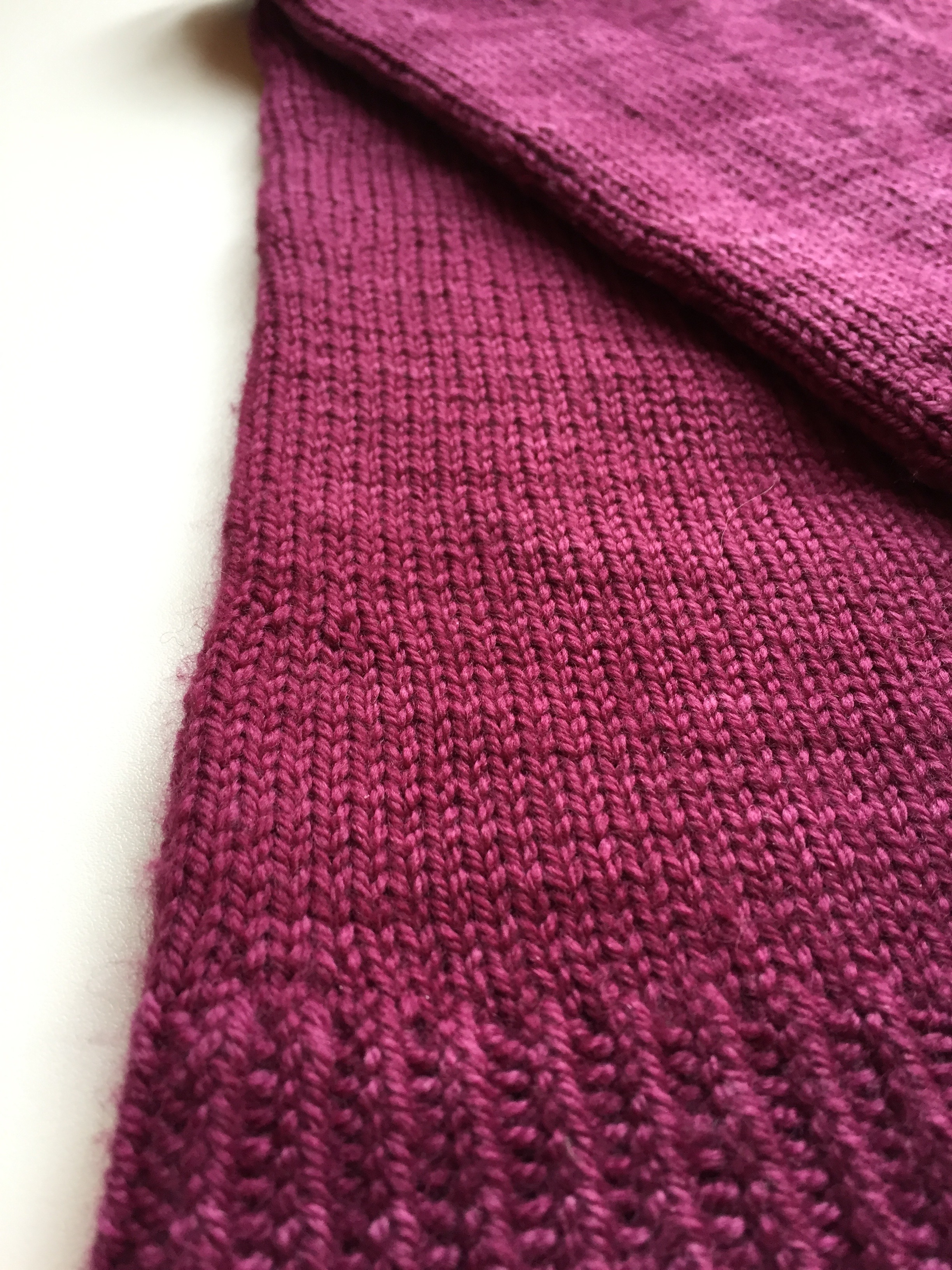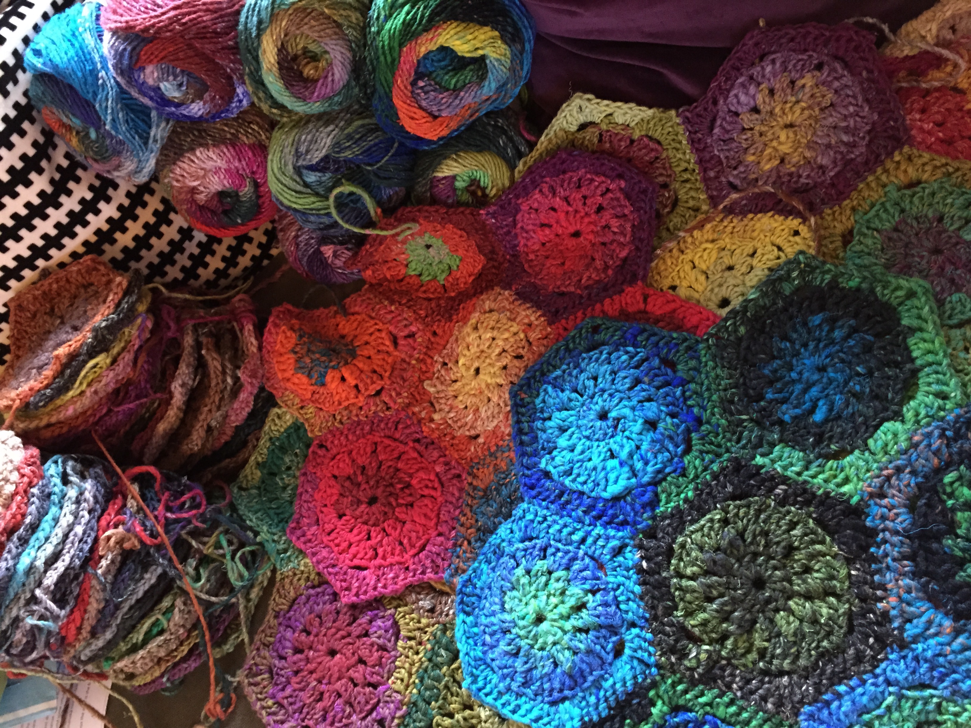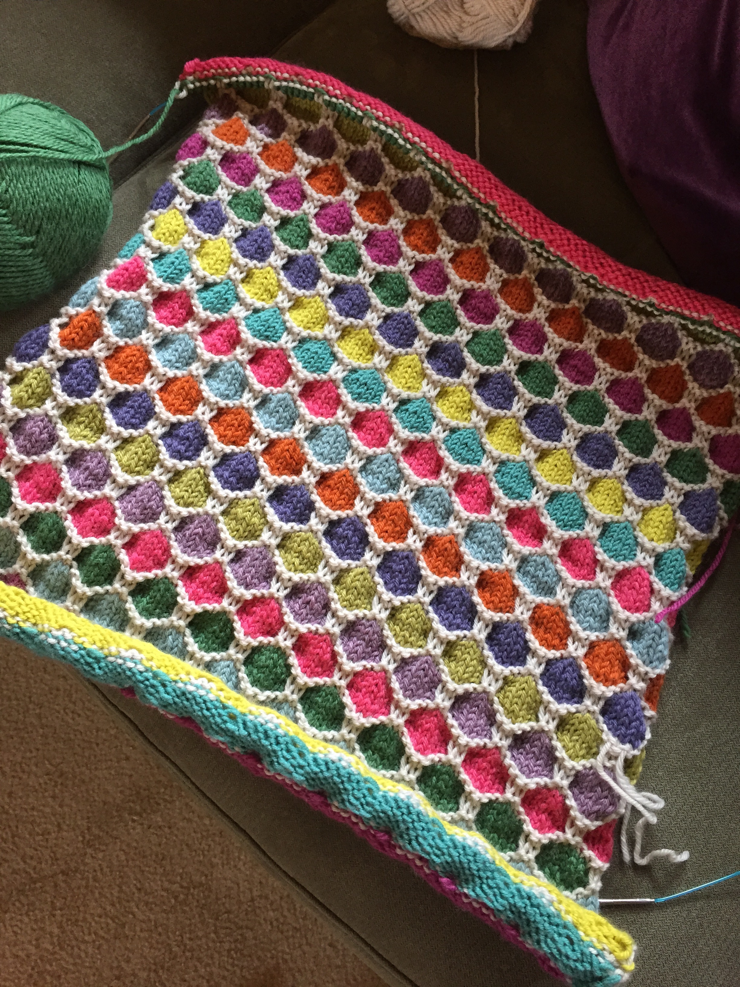The baby blanket was completed and blocked last week. It is a relief to get it done before the baby arrives. I’m pretty pleased with the result too! The yarn was stash yarn, mainly made up of Jo Sharp classic DK wool, with a bit of this and that thrown in. The pattern: Honeycomb Stroller Blanket is free and is pretty nifty if you ask me. The slip stitch pattern forms the hexagons therefore there are no patches to sew together (just lots of ends). If I were to make it again, (and that’s a possibility if more babies arrive in my family), I would do a provisional cast on at the start, to make the border easier to pick up and knit. The other alt that I made was to make the border a garter stitch one, and rather than picking up all the way around, I did each side individually, increasing at the edges each right side row to make the mitred corners. There will be some better ‘glamour’ photos taken when the cute baby arrives.