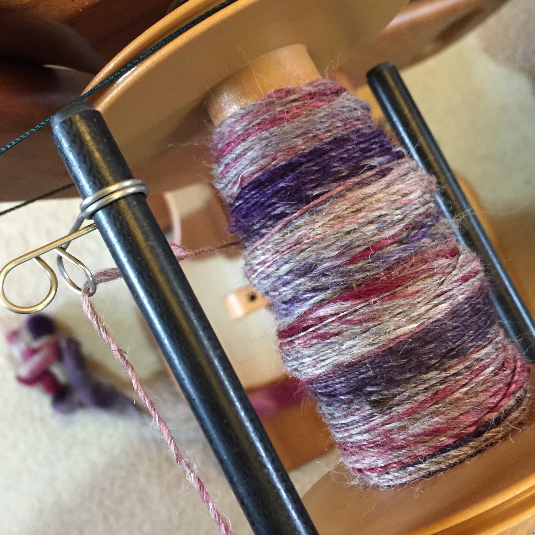I’m currently spinning up some Thylacine BFL mixed with camel. A couple of weeks ago, I discovered I had 2 similar colour ways of 200 grams each; so I thought perhaps I could ply the 2 colour ways together, in something of a 4 or 5 ply and have enough to knit myself a vest of some description. Stay tuned for that.
