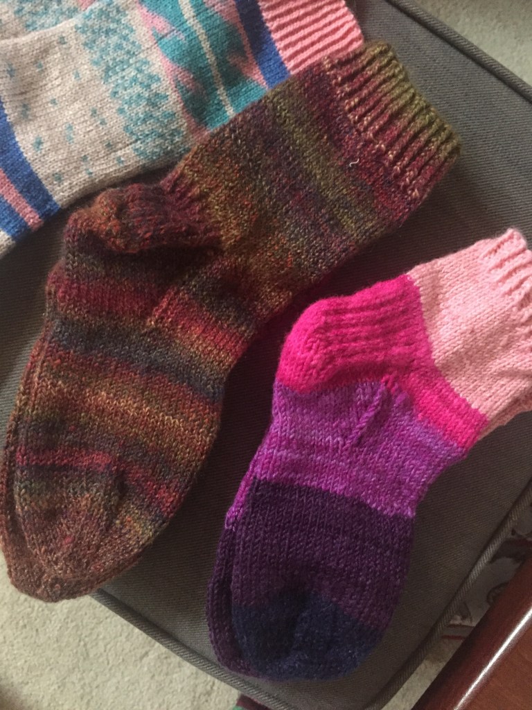 The striped pair is the Richmond Knitters Christmas yarn from 2019, hand-dyed by our favourite dyer, Danni of Half-baked Hand dyed on Etsy. The pink and blue pair are Arne & Carlos Regia yarn, which I nicknamed my Corona socks, because I couldn’t get the pattern tension right on the second sock, see the aqua wave on the top sock? That’s how both socks should look.