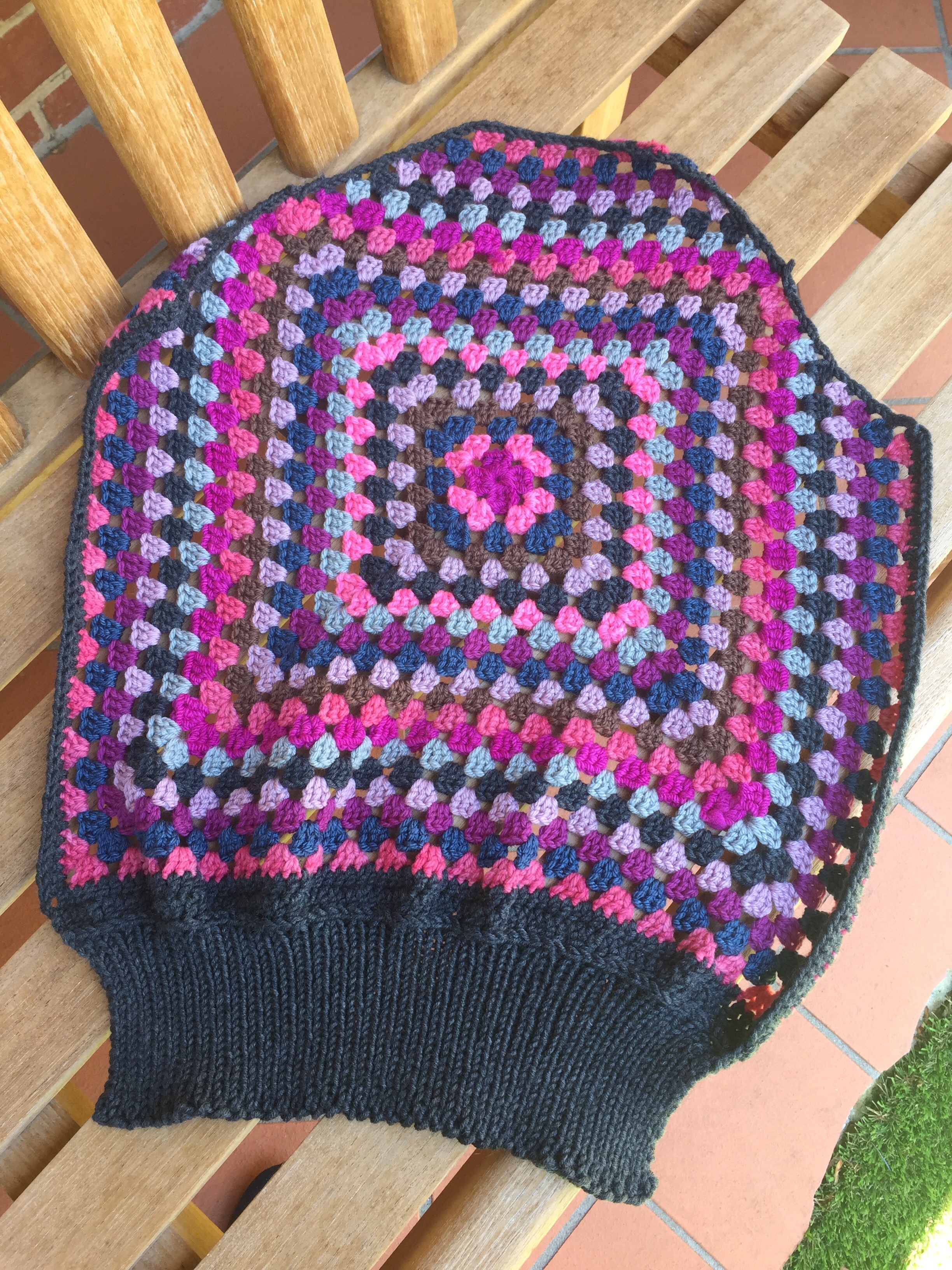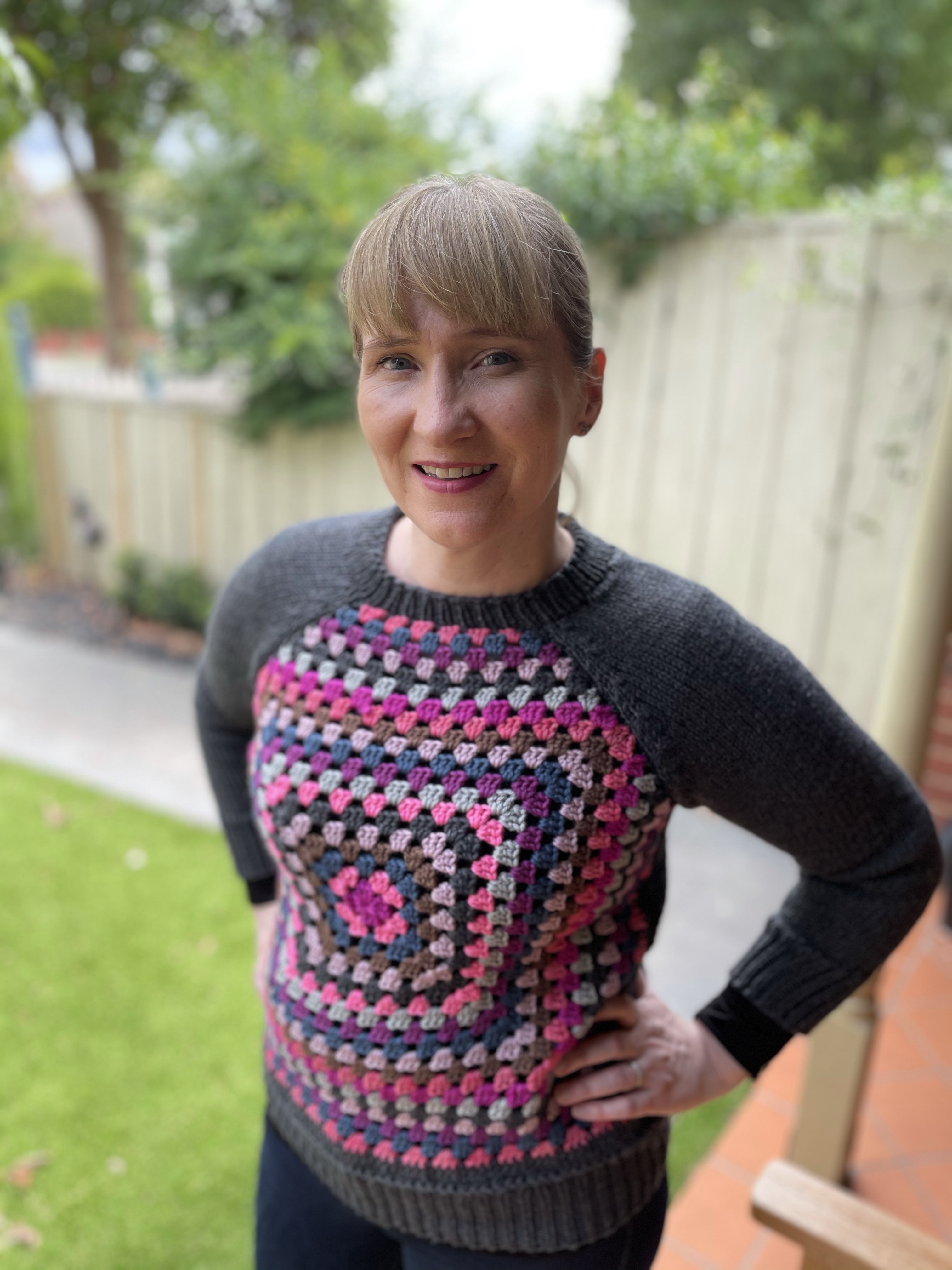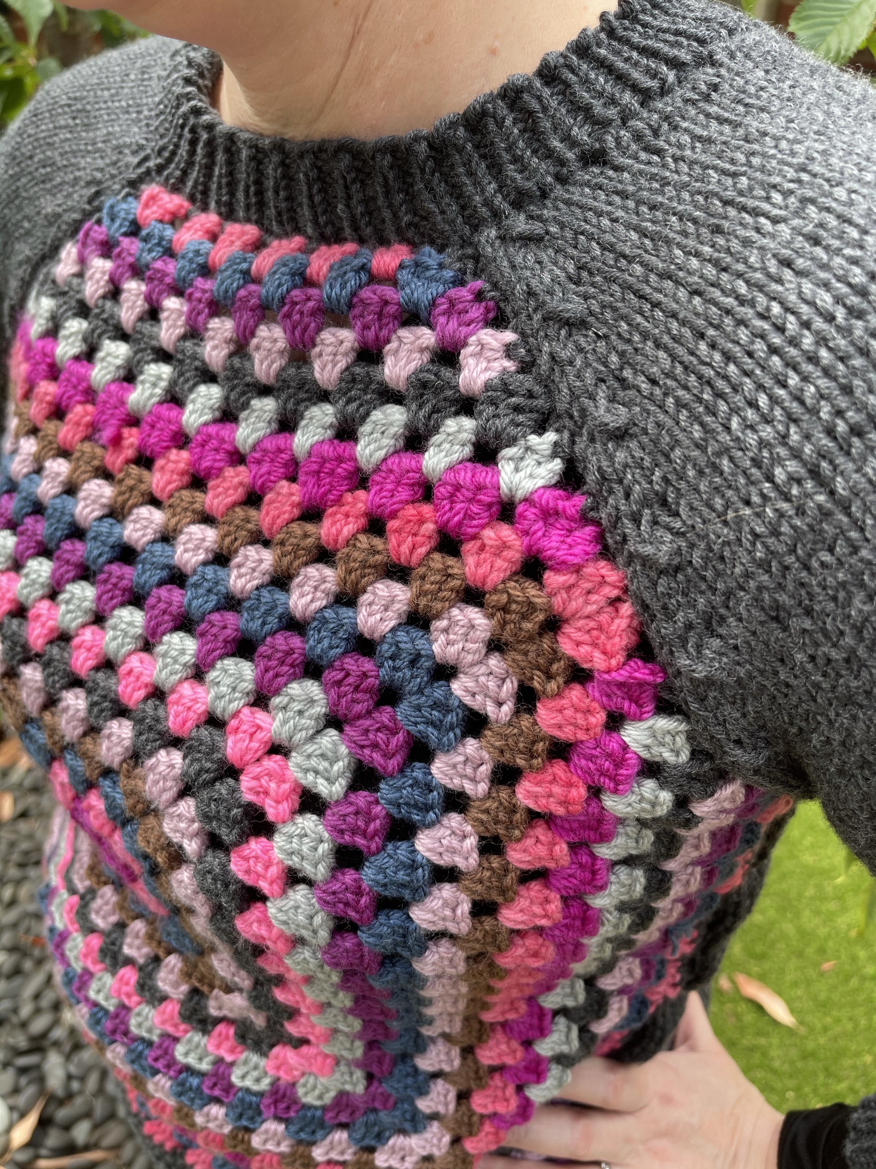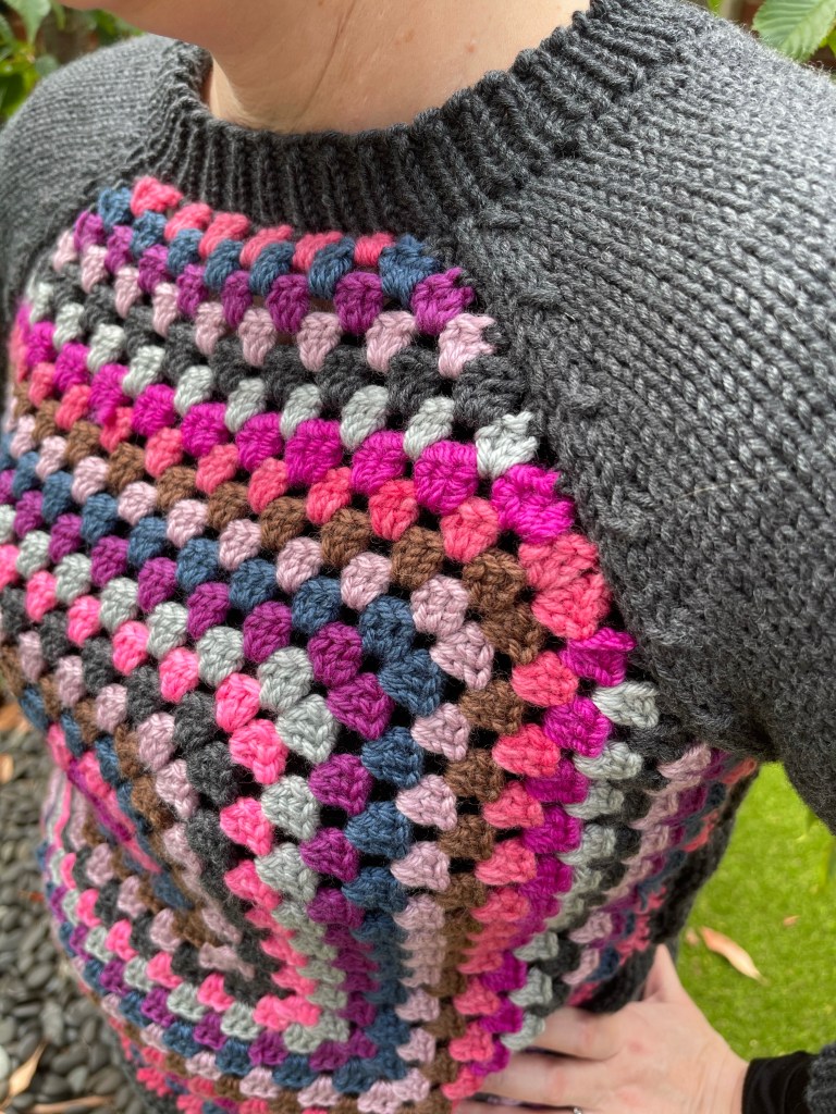 Before the failure of the sweater that shall not be named… I finished crocheting and knitting and piecing together my Granny Raglan Pullover.