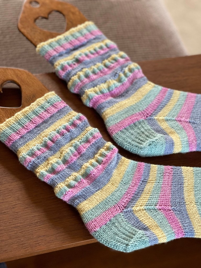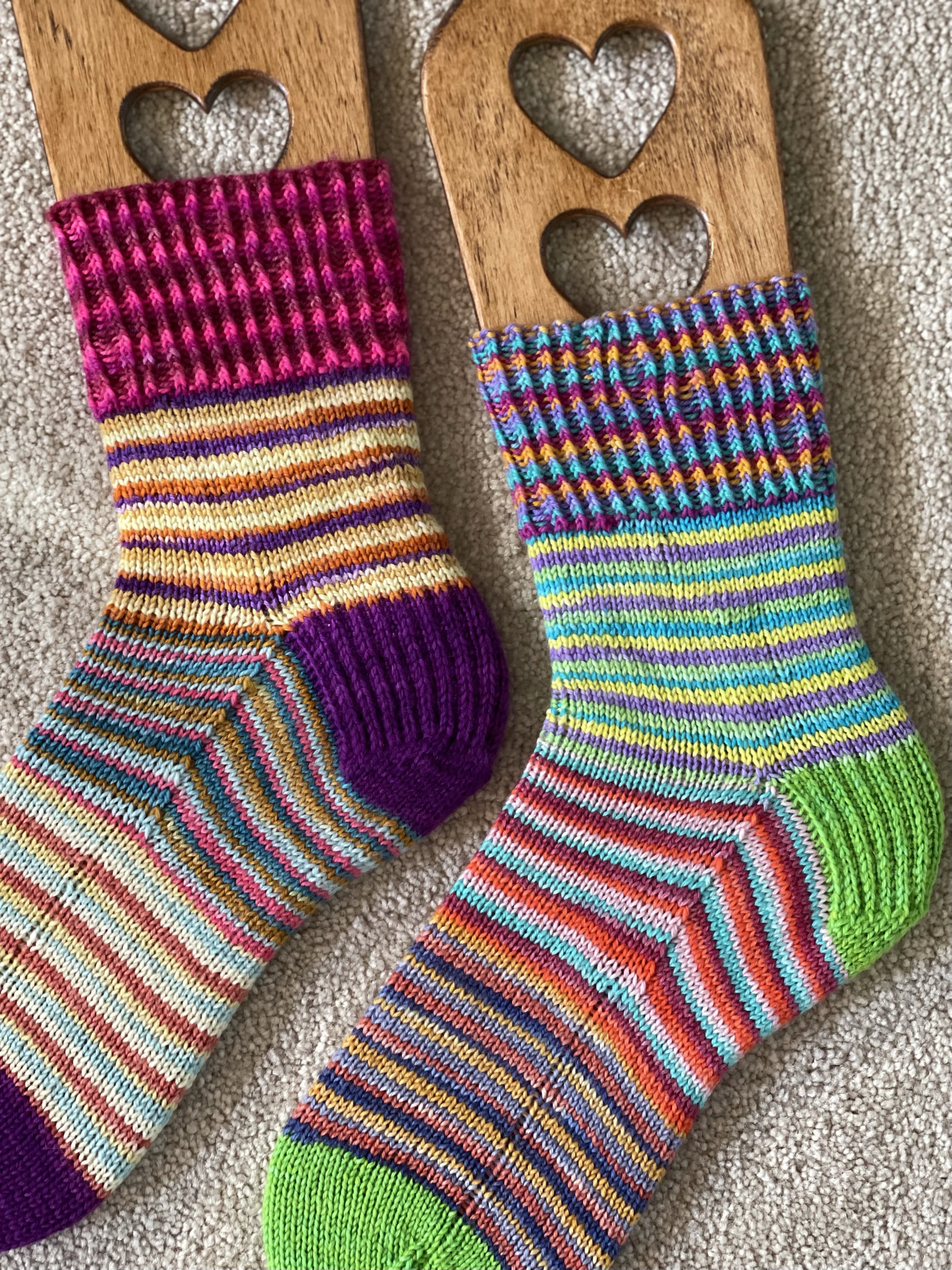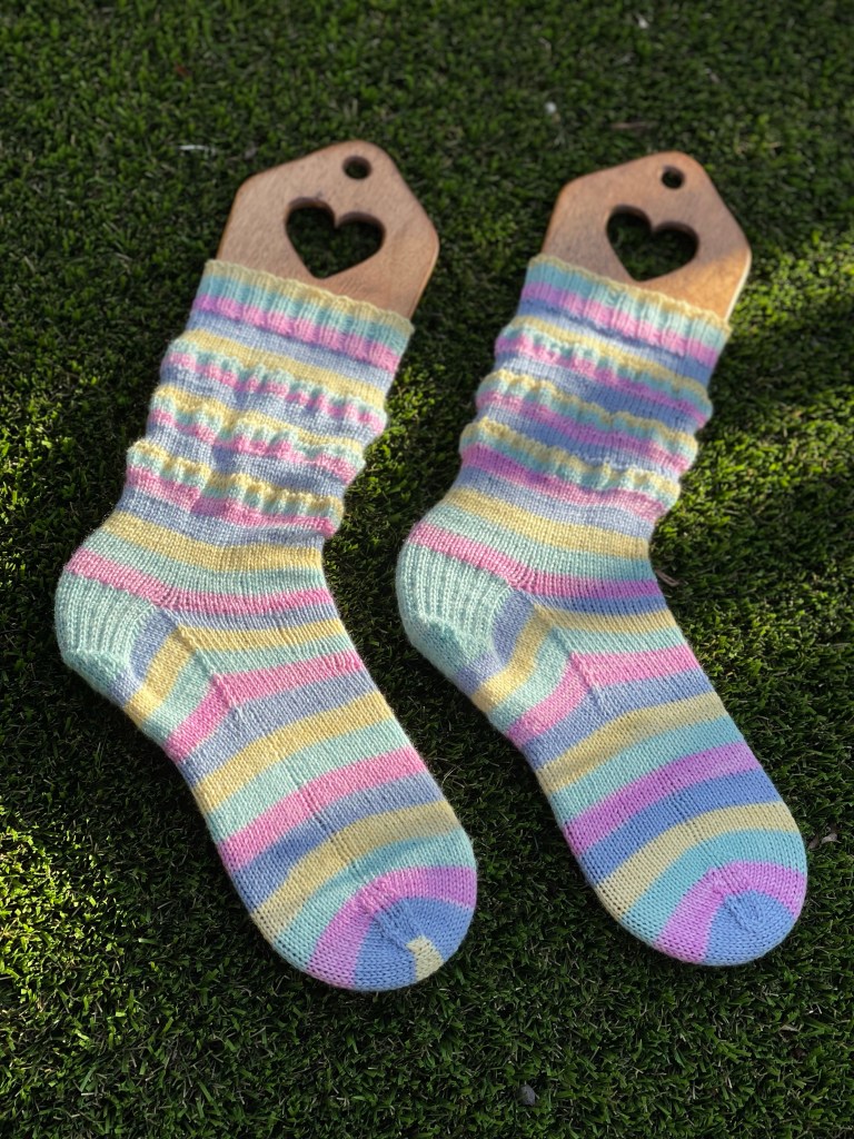 The yarn is once again by Danni of Halfbaked Handdyed, the colour way name is Pee Wee. I think the pattern and yarn are a perfect combination. They remind me of the ‘bobby’ socks I used to wear in primary school.