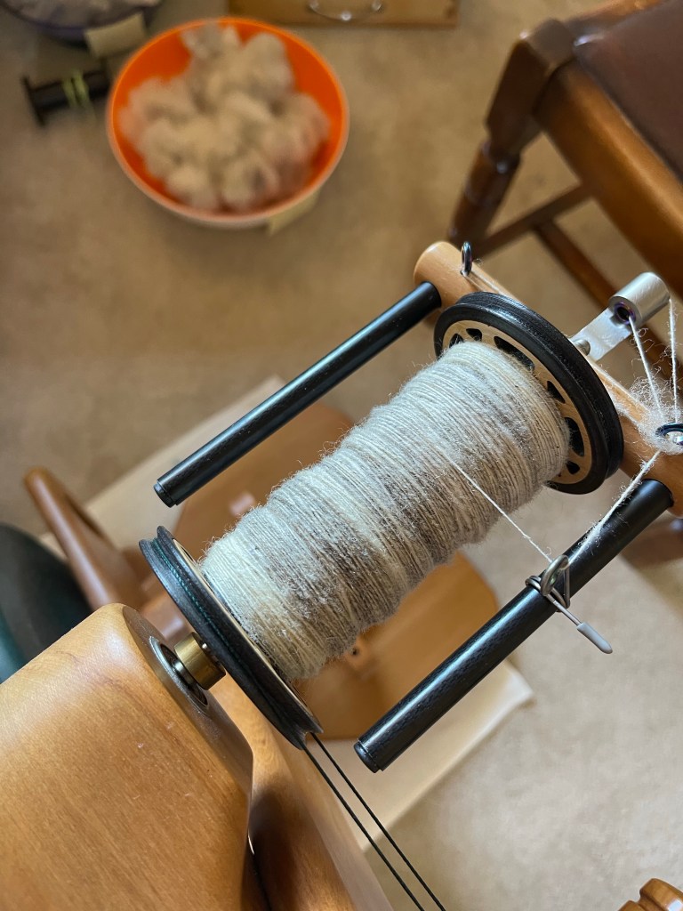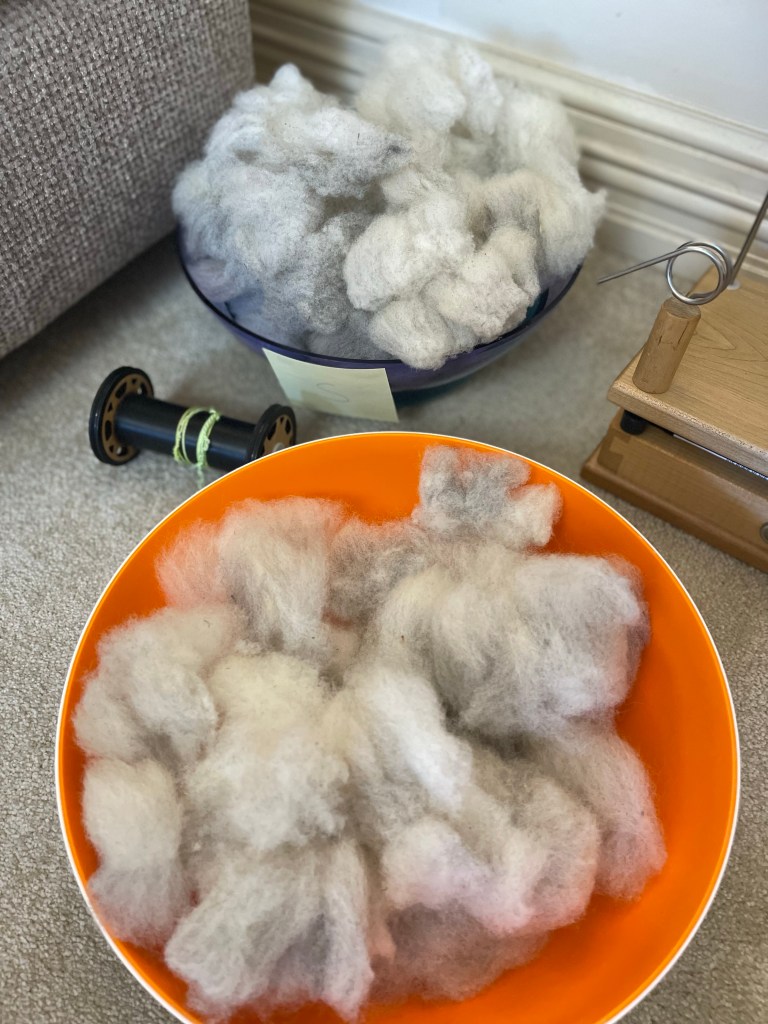I was able to get some light grey Shropshire, as well as some darker Shropshire. I’m going to spin it as a 3 ply crepe yarn, to give it extra strength. I plan to do some Natural Dyeing to get another colour in for these colourwork socks, and I think I might overdye the darker Shropshire, so it will be a more intense contrast.