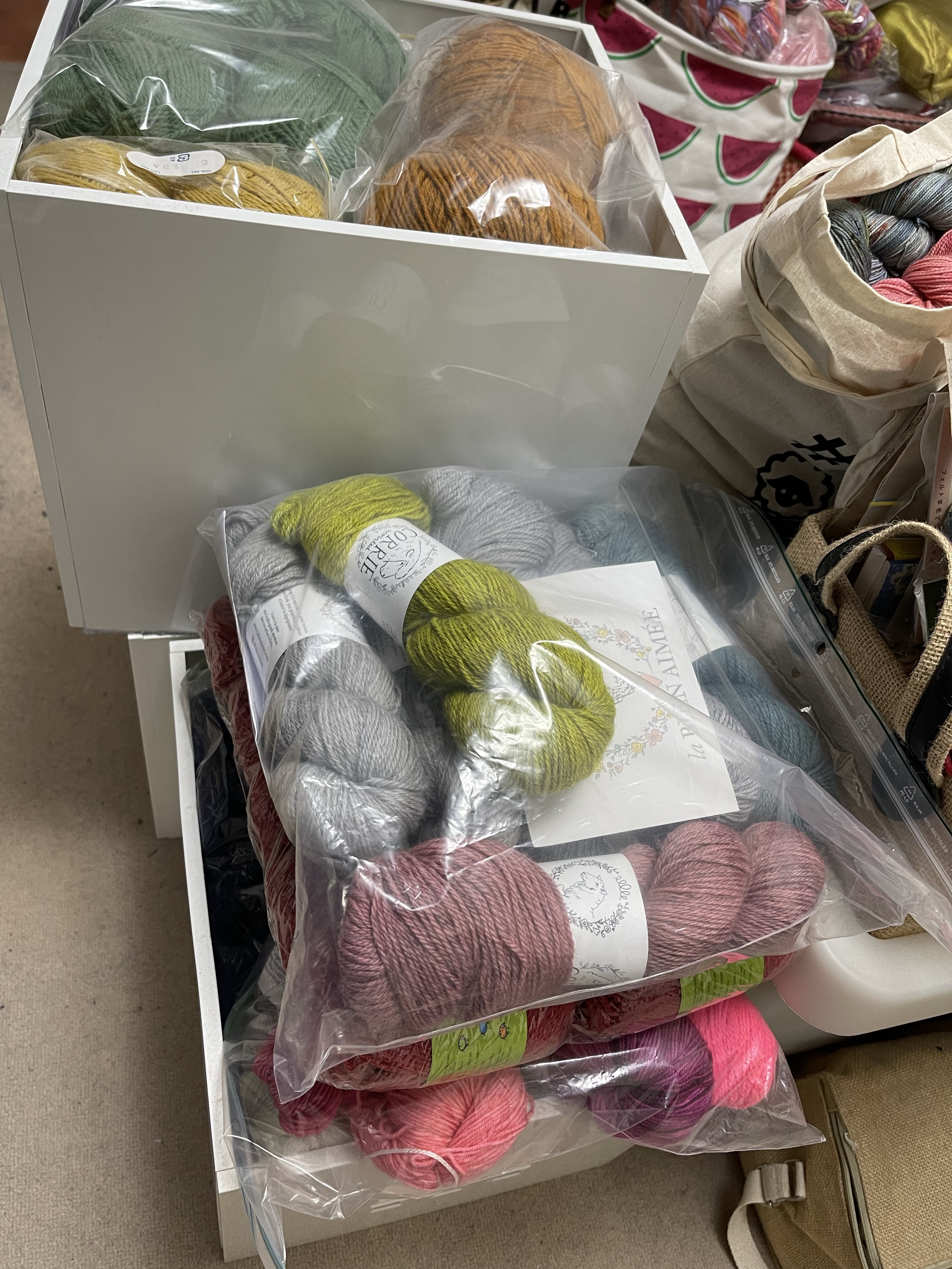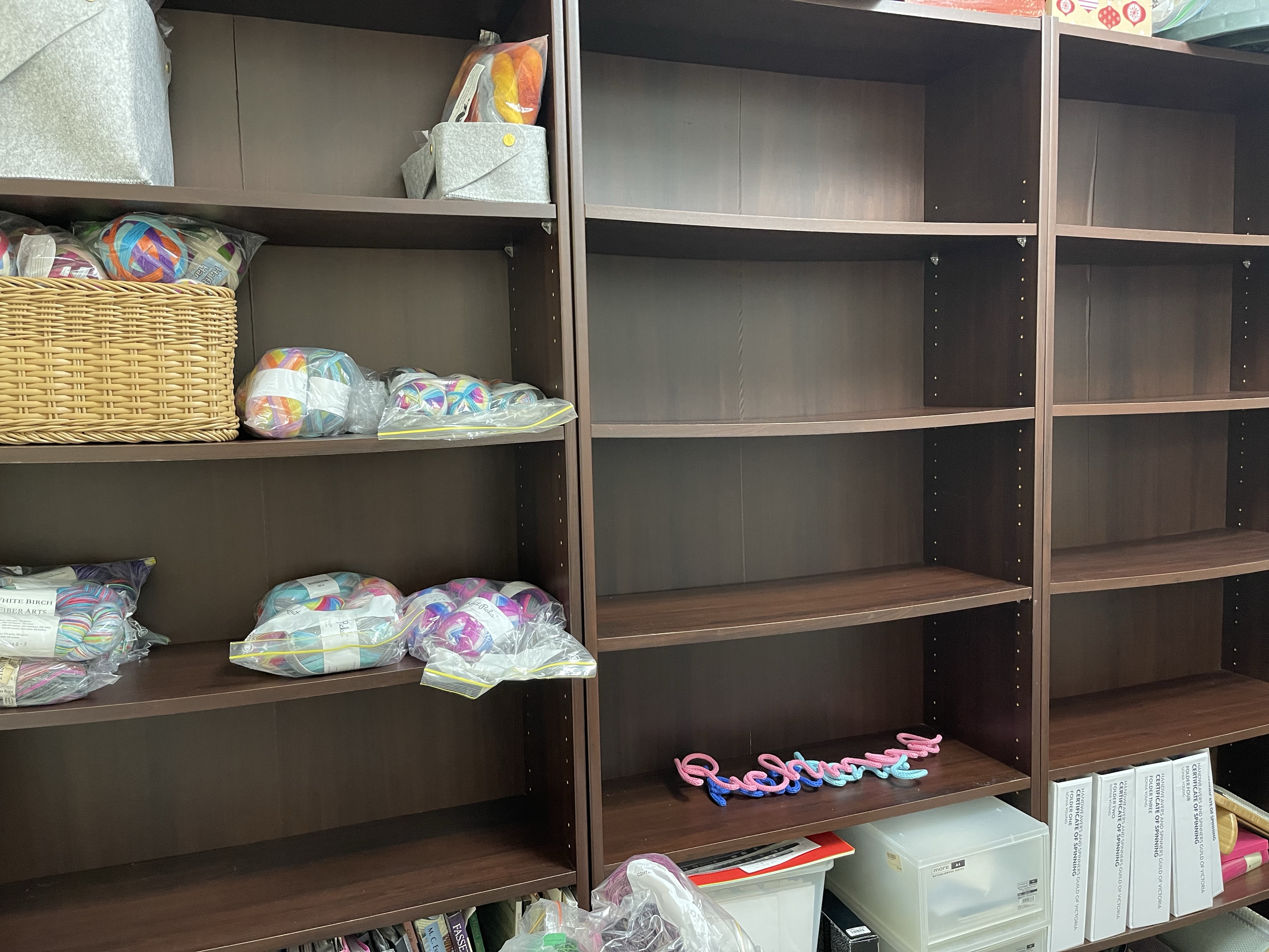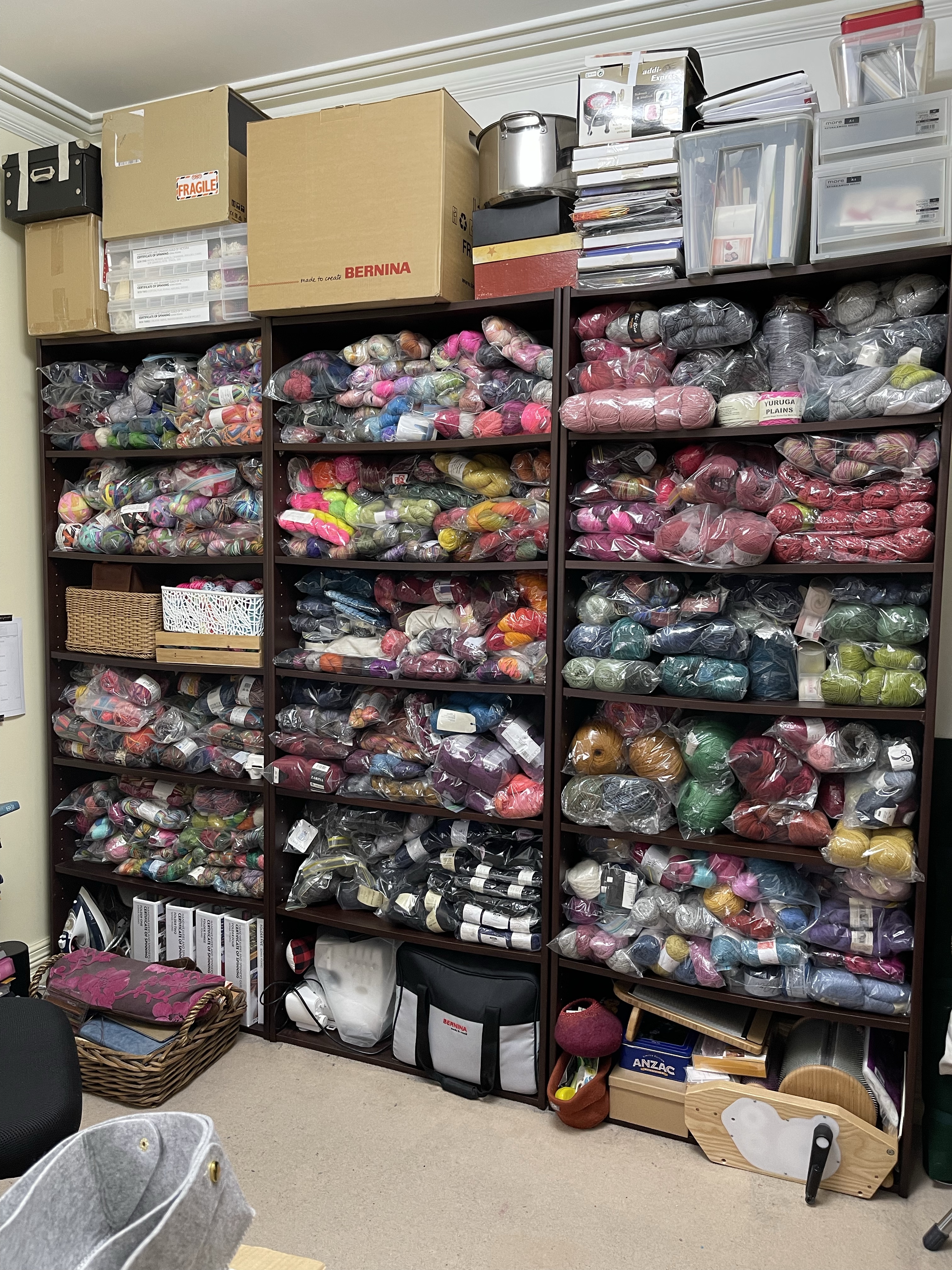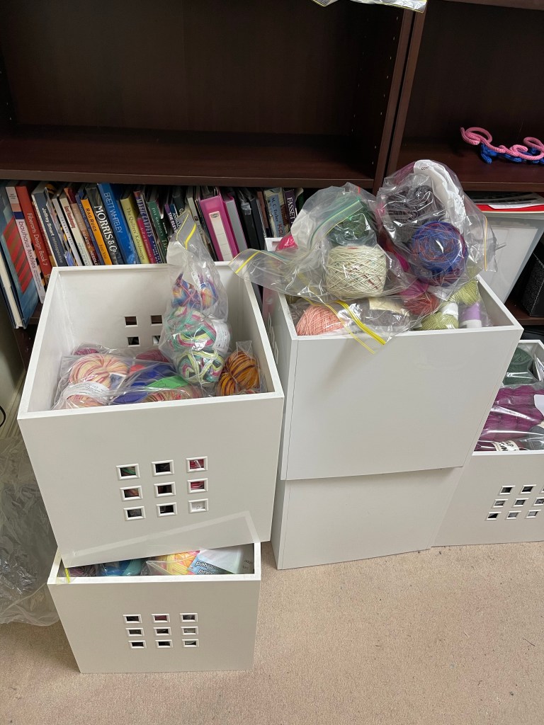 I was planning to purchase baskets to fit these new shelves, but after unloading ‘most’ of my yarn into the shelves this weekend, I realised that I liked seeing all of my yarn, baskets would obscure the view, as well as take up valuable shelf space. The plastic is not pretty, but I don’t want to leave my stash unprotected from dust or critters (not that we’ve ever had a moth problem (touch wood). The feeling of seeing all my yarn in one place is a mixture in equal parts of JOY and then OVERWHELM!