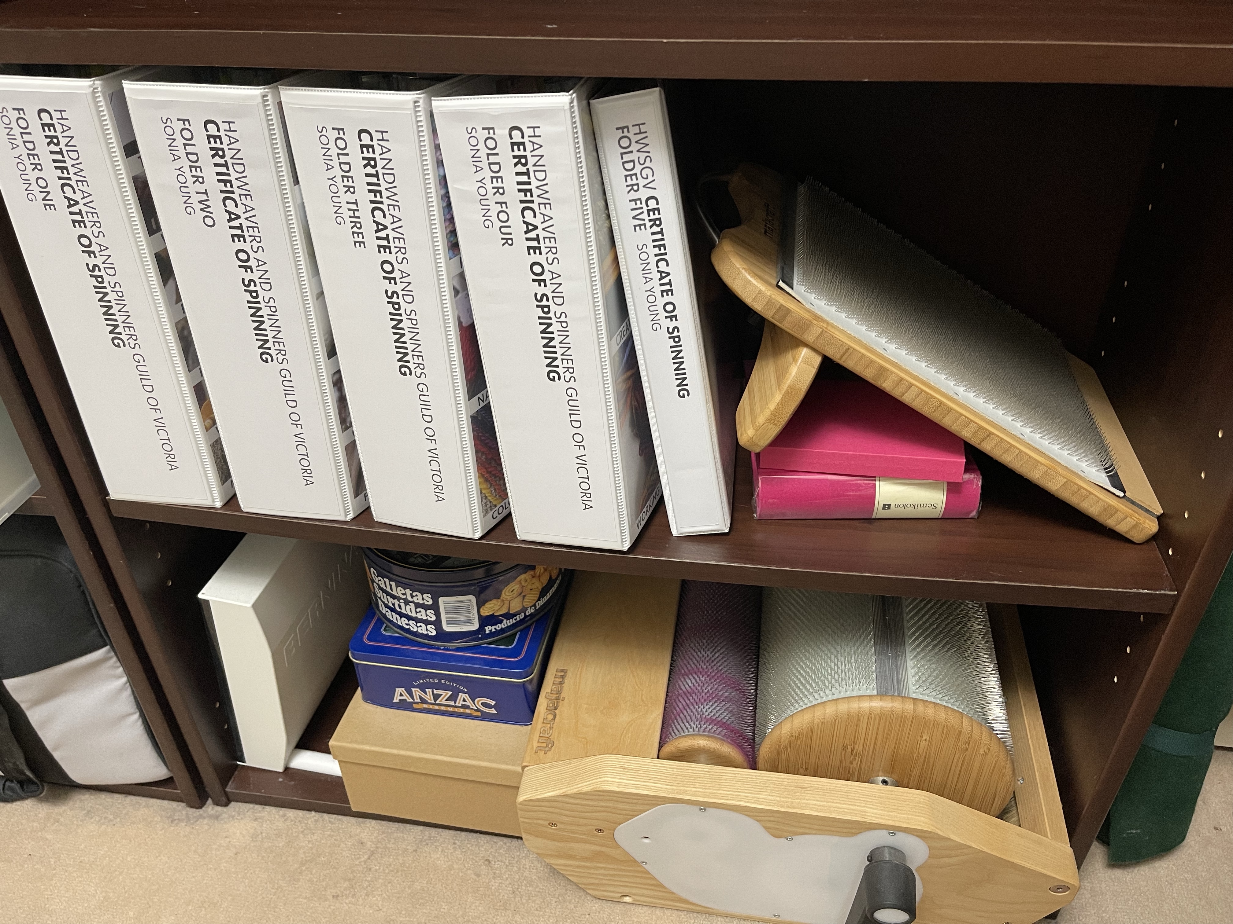 I saw my chance to rearrange some things up in our house this week whilst Damian was away for work. I didn’t have a lot of time, so there was really no time to lose. Tuesday night after work, I began by migrating D’s books into my old yarn shelf which now resides in the hallway. I dusted and wiped things clean, sorting his books in a logical order into his new bookcase; my part-time job as a teenager was a library shelver 2 nights a week at my local library. It was/is so satisfying to shelve books in order. The migration took hours and hours and then on Wednesday night after work, the work on the craft room continued, I was exhausted, but determined to achieve my goal of finally having my own room for craft.