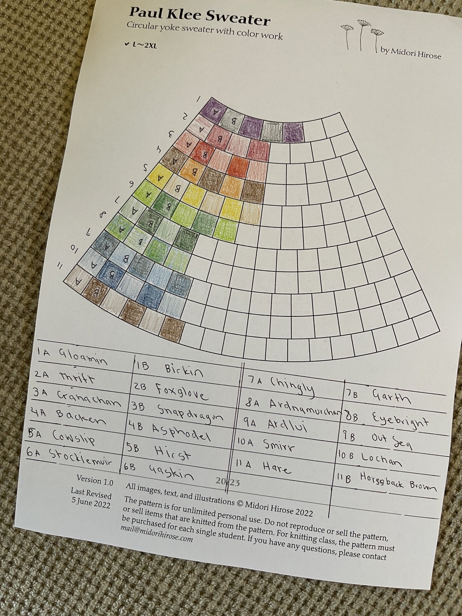 Starting with the Paul Klee sweater by Midori Hirose. Whilst I thought had my colour sequence sorted, yesterday when I started colouring-in my planning sheet, I discovered I needed 11 rows / 22 colours for my size. I originally had mistakenly thought I only needed 9 rows / 18 colours, because I had just referred to the pattern photograph. Luckily, I was able to come up with the additional colours and sequence from the 24 ball Kate Davies advent calendar. Although I discovered, blue might be her favourite colour, and she is missing a light purple to complete the colour spectrum.
