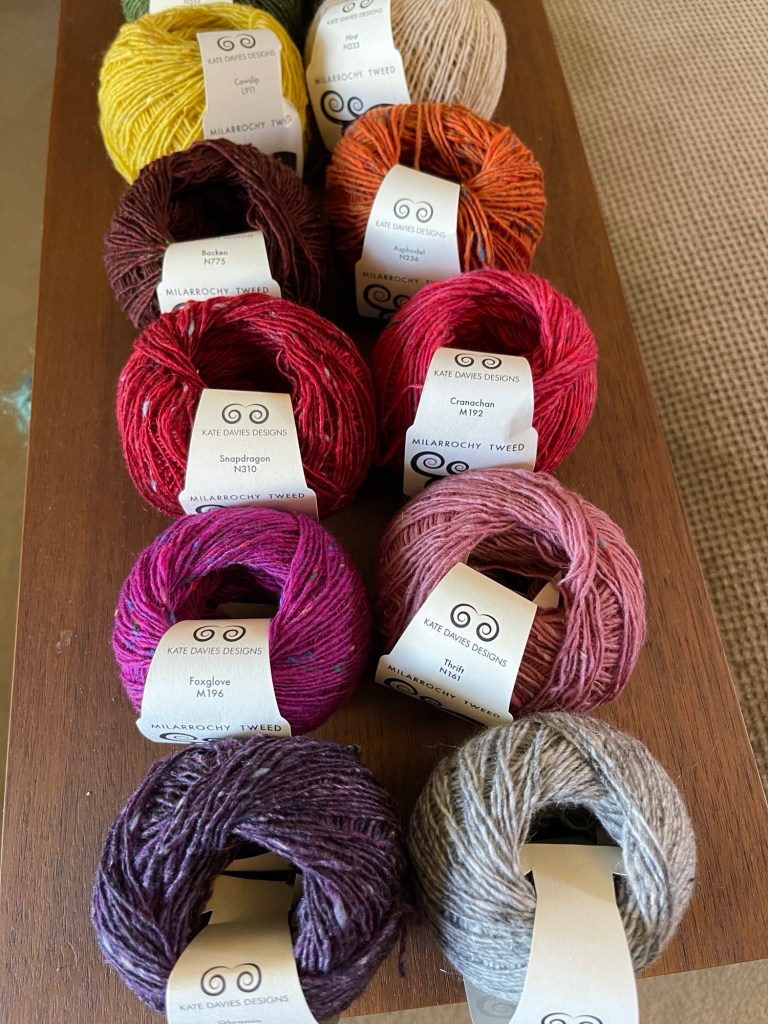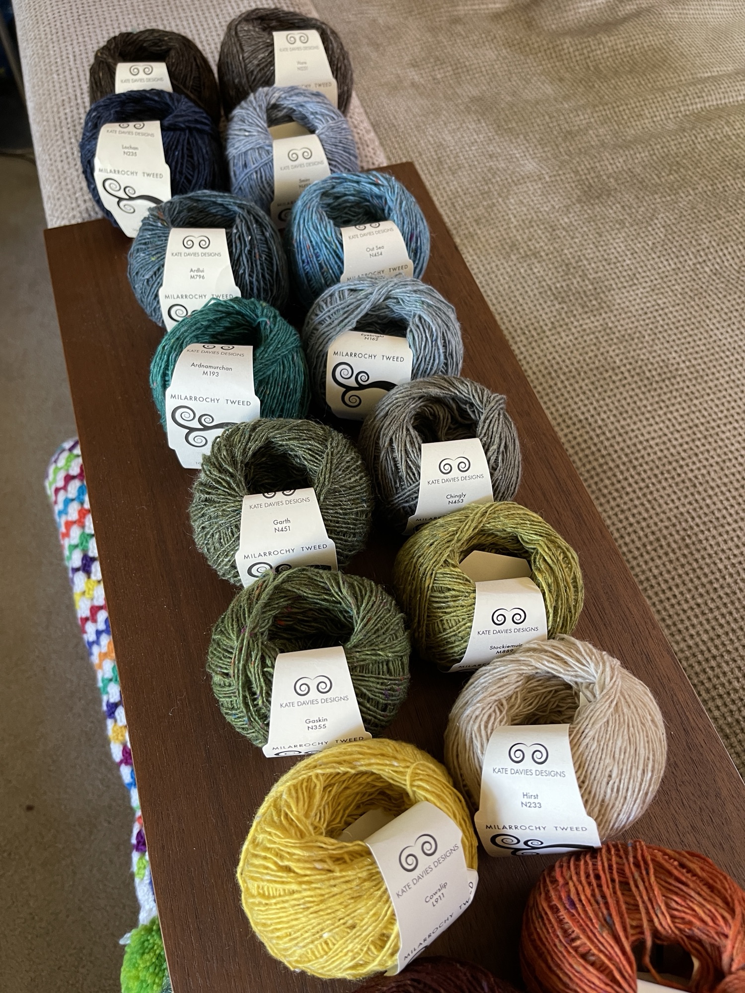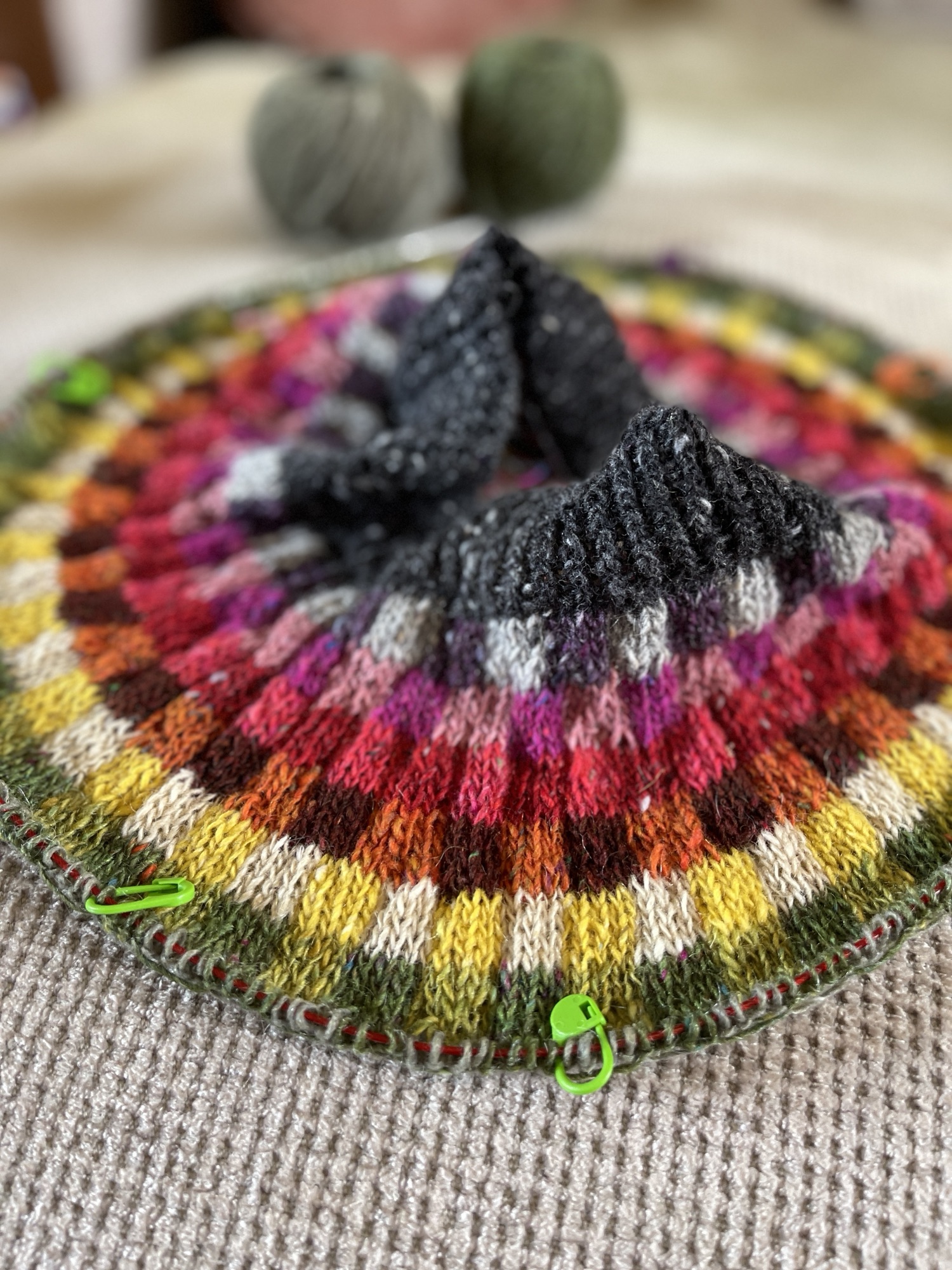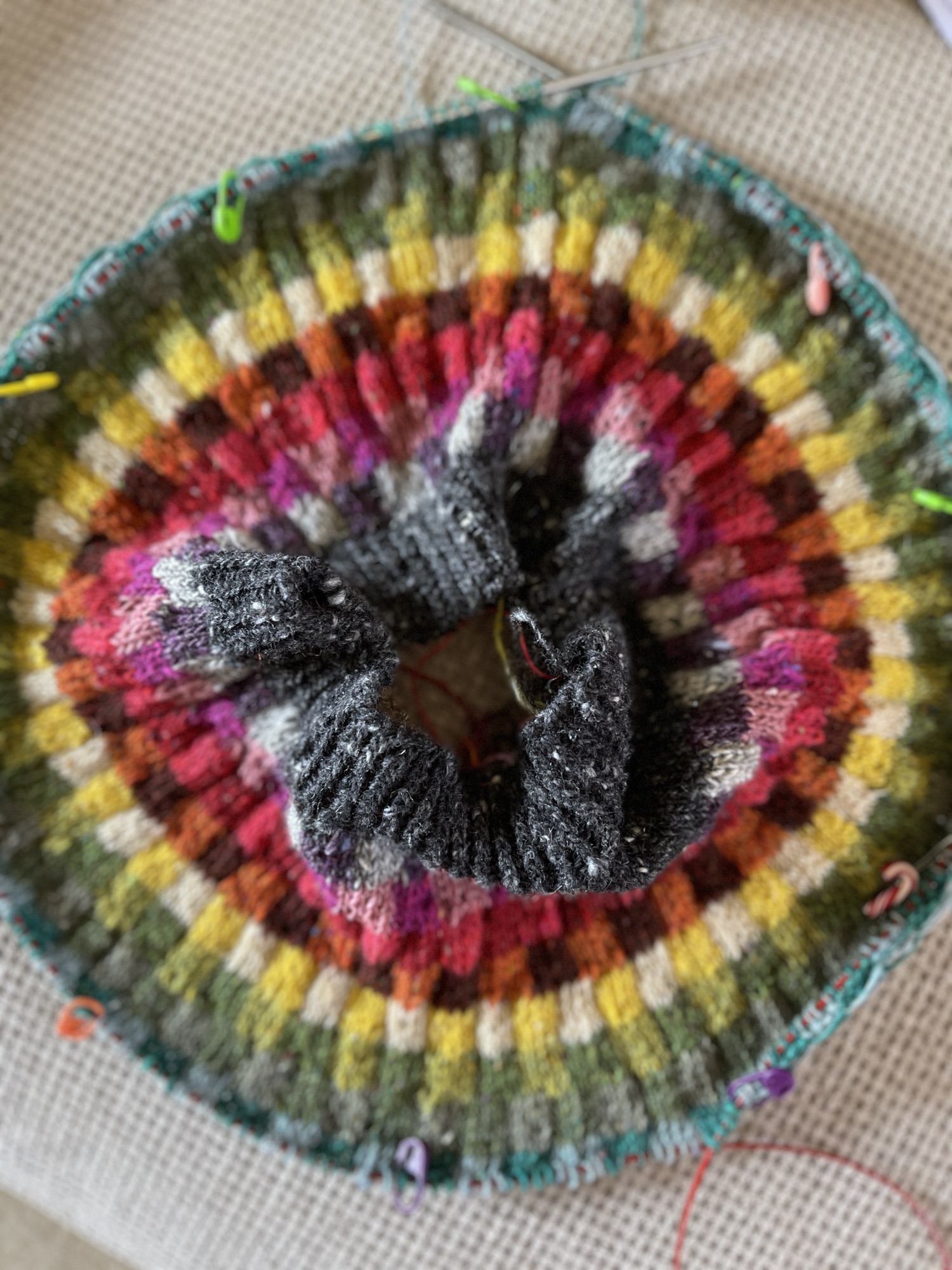 Whilst I am working from the limitations of the 24 colour palette of Kate Davies, Milarrochy Tweed (compared to the hundreds of colours in the Jamieson & Smith range) I think I’m still achieving a lovely rainbow of colour, and there’s still 2–3 rows of colour to go.