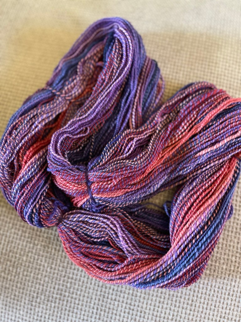 I am thrilled with it. The fibre is from a Southern Cross Fibre Club, it’s organic merino and the colour name is Tokyo. It is worsted spun, in a fractal spin, it’s come out to a light fingering weight yarn. Perhaps I’ll make a hat with it.