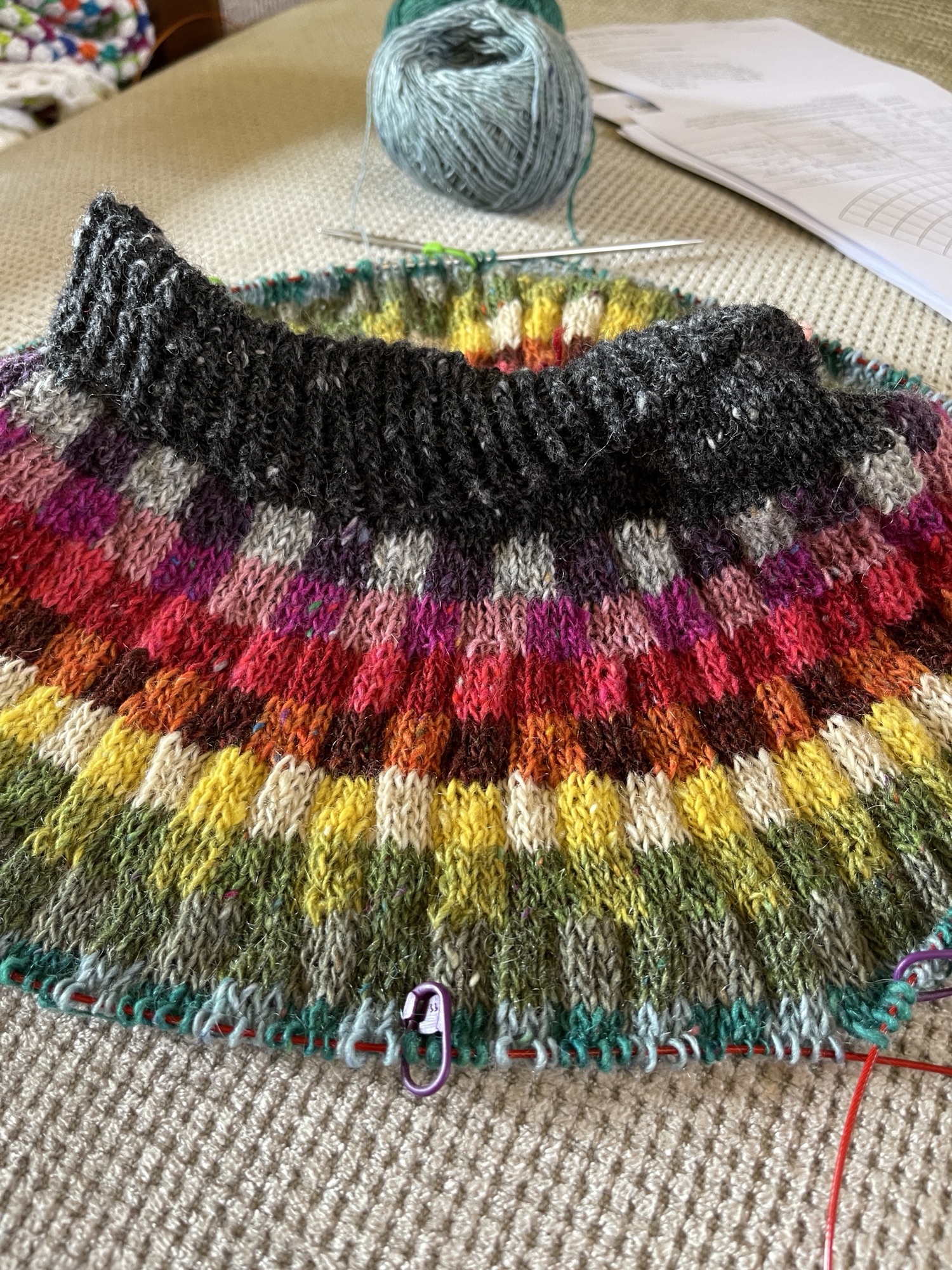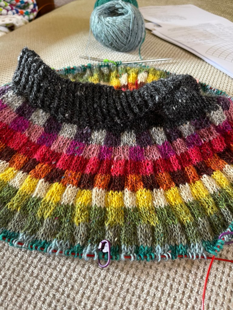 Alas, my holiday is almost at it’s end. I am not able to work so intensely on the yoke over the next 2 days, as I’m off doing something fun, but hopefully I’ll be able to squeeze in the final 2.5 colour rows before I return to work on Tuesday.