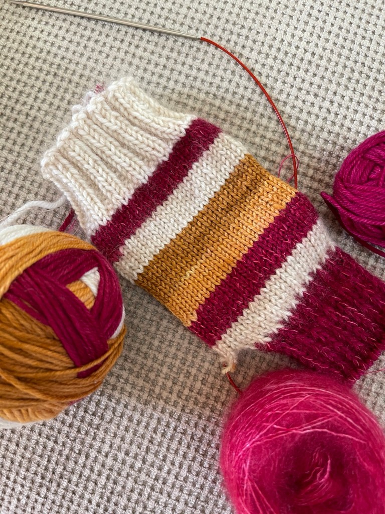 A couple of weeks ago, one of my sisters whose birthday is coming up, asked if I could knit her a pair of fingerless mitts. Wow, I don’t often get requests from family members to knit them anything. It doesn’t take a birthday for me to make for anyone, especially family. So I went to my stash. I gave her some yarn options, from which she made a selection, then I gave her a few more options (based on her first choice) but she still stuck with her original choice. The yarn is deep stash, Colinette Jitterbug. Gosh, it’s such a good yarn which sadly has been discontinued for many years now. The colourway is Forest.