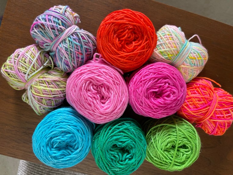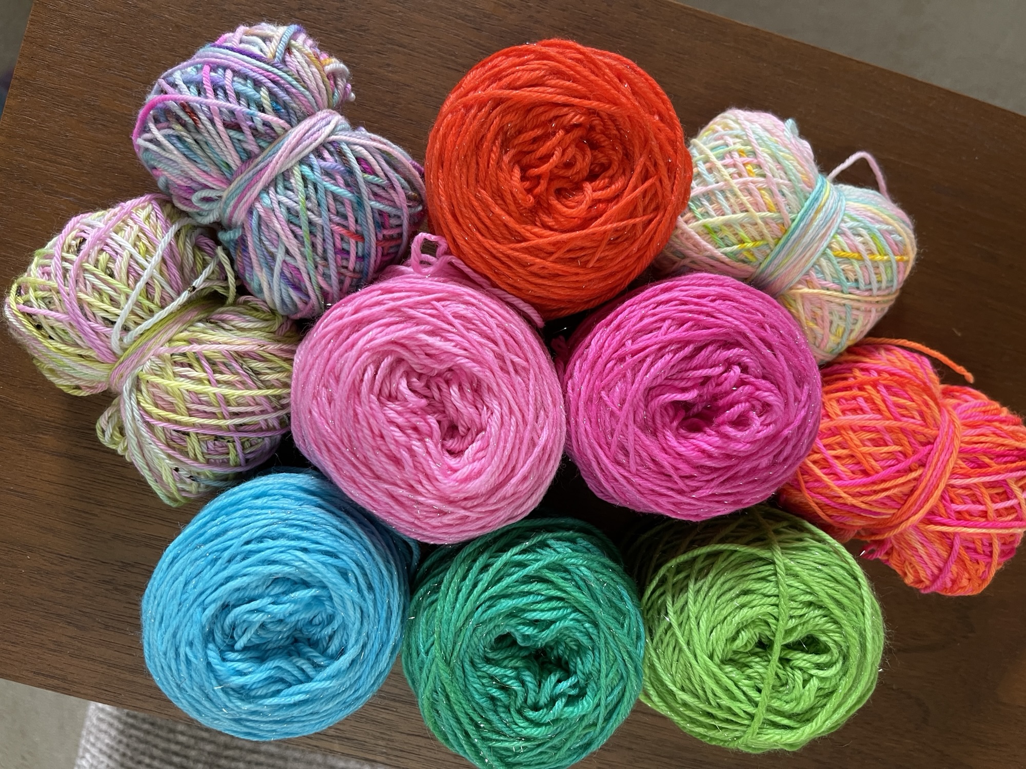 The socks require 5 mini skeins of yarn. I’ve wound up some minis from a My Creative Garage mini skein set that I bought at last year’s Bendigo Show (go me!), and I’ve also gathered some speckled minis from a Little Woollie advent calendar. I’ll only need 5 of these minis, but I’m keeping my options open for now.