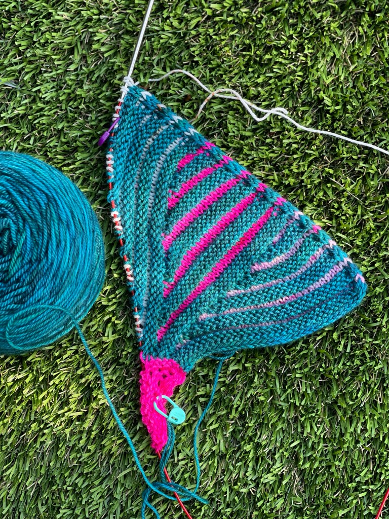 I’ve now completed section 2, the wedges section. I have to say, I was not a fan of this section, it was fiddly, took a long time and I don’t have much to show for it! I want to knit hard, and these little short rows are just not doing it! Not to worry, I know that from here on in as the sections get bigger because the shawl will get bigger, I’m hoping there’s less fussing and more knitting or knittin’ as Stephen would say.