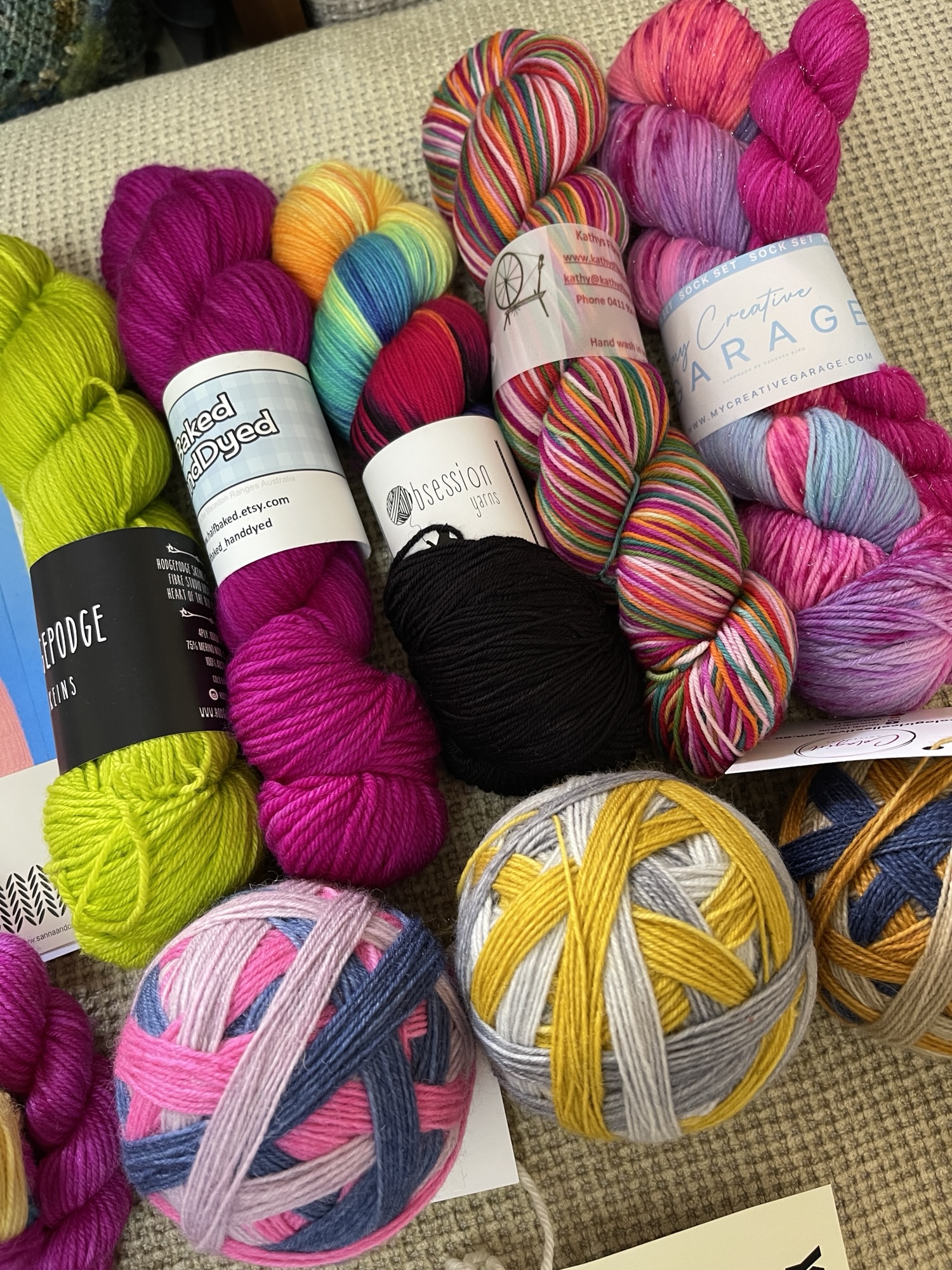 The socks require 5 mini skeins of yarn. I’ve wound up some minis from a My Creative Garage mini skein set that I bought at last year’s Bendigo Show (go me!), and I’ve also gathered some speckled minis from a Little Woollie advent calendar. I’ll only need 5 of these minis, but I’m keeping my options open for now.
