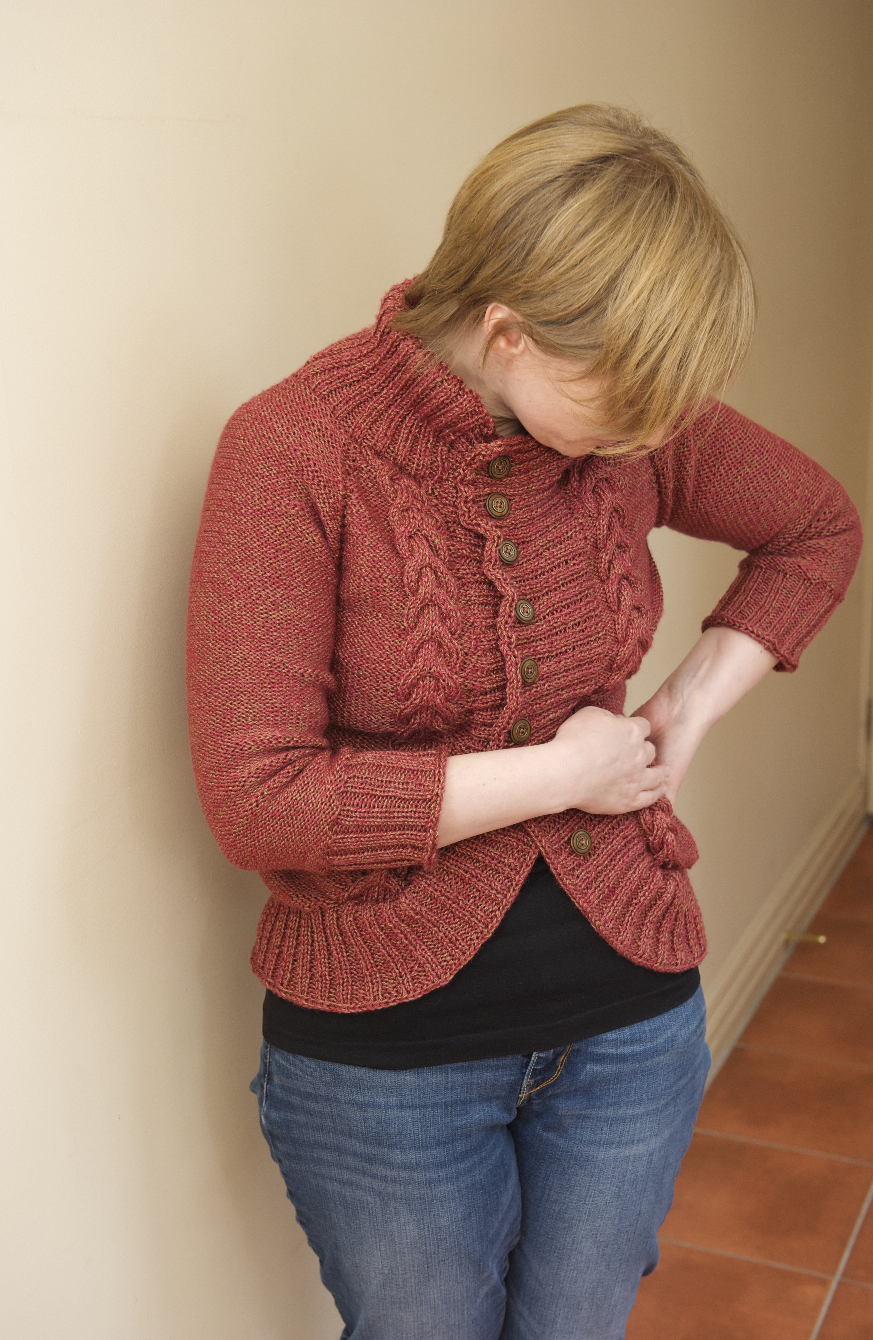 My only reservation, and there’s always one; is the shaping around the cables at the bottom of the fronts. It doesn’t sit flat, and I wasn’t really sure why. I popped over to Ravelry to see a whole lot of other people encountered the same thing, so it’s not just me. I saw that one knitter dealt with it, by re-knitting and re-shaping somehow. I didn’t recognise or find this fault in other people’s projects, until I saw it in mine, then I could see it everywhere. I’m a touch disappointed, but not devastated. I still think it’s extremely wearable despite an odd lumpy part around the waist, the cables kind of disguise it. I would like to point out the lumpiness wasn’t visible until after the 8cm of knitted on band was complete. There was no way I was pulling out all my knitting for a slight glitch, that I have no hope of actually fixing anyway (let’s be honest). I haven’t blocked this garment yet, and if this, by some miracle fixes the problem, then I take it all back Veera and your record is intact.